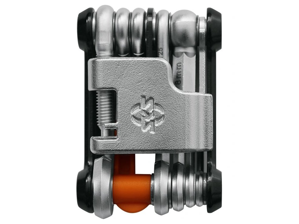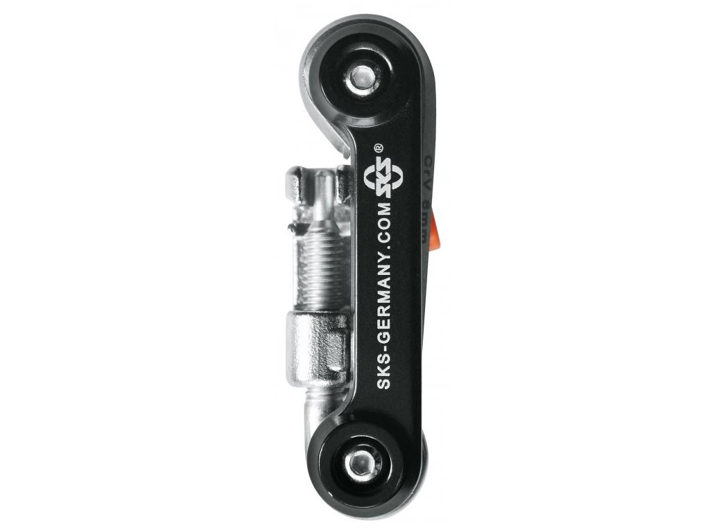 SKS TOM 18 je multifunkční nářadí s 18 funkcemi, které obsahuje nýtovač, imbusové klíče (2,5 / 3 / 4 / 5 / 6 / 8 mm), plochý a křížový šroubovák, TORX T25, dvě montážní páky, centrklíč G14/G15 a otvírák na láhve. Toto multiklíč je ideální pro opravy a údržbu kola na cestách. Součástí balení je také praktický obal s logem SKS, který usnadňuje přenášení a chrání nářadí před poškozením.